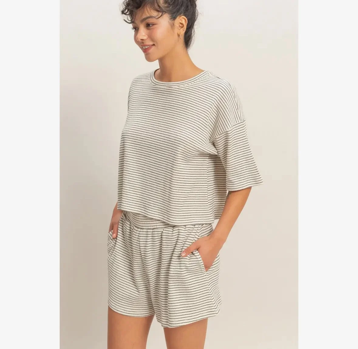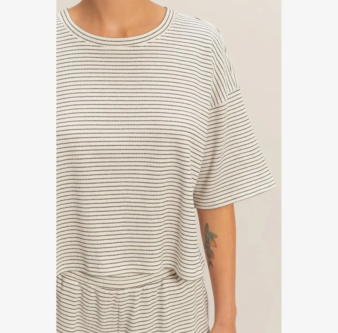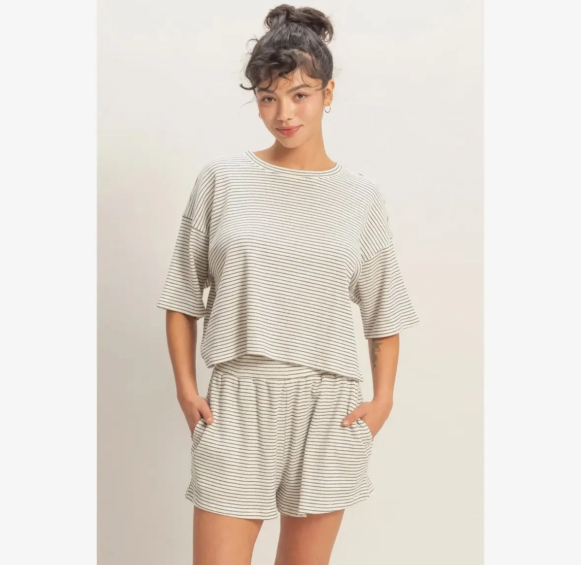 This textured cotton blend set is everything! A stripe moment never goes out of style.